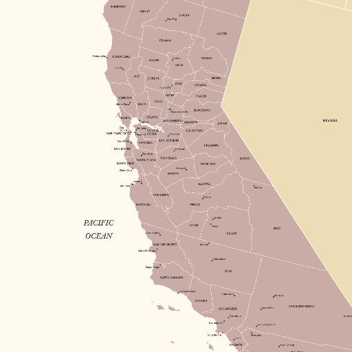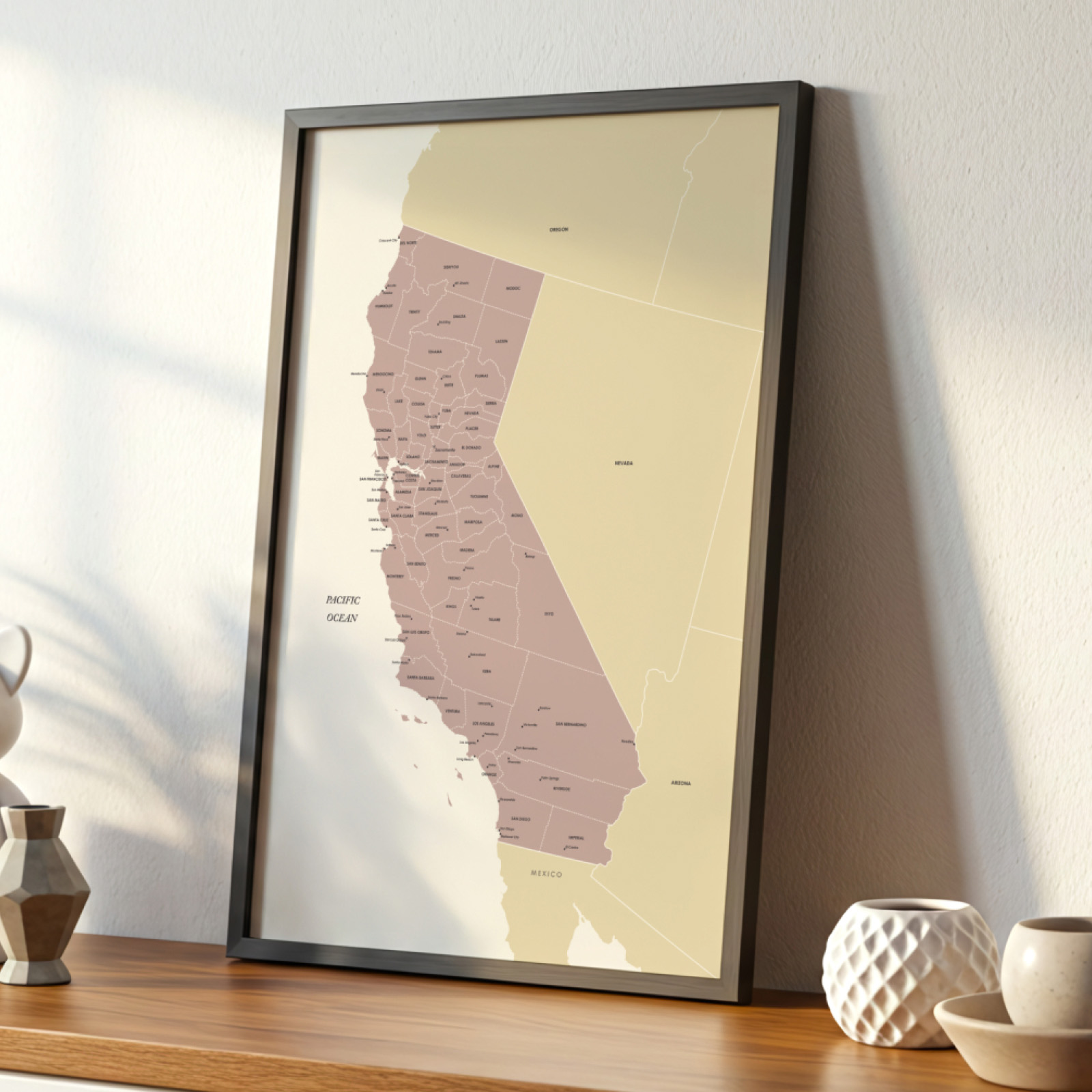 If you love neutral wall décor, earthy tones, and clean visual structure, this map was created for you. The design avoids clutter and focuses on balance – counties are clearly outlined, city labels are legible yet understated, and the composition lets the shape and complexity of California shine.