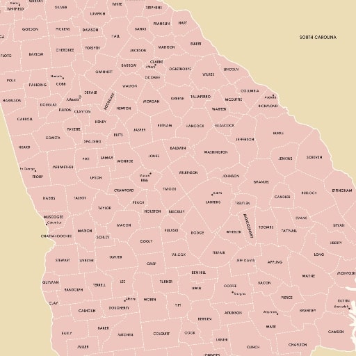 - The map includes Georgia with counties, enabling clear county-level reference without clutter.